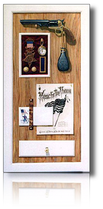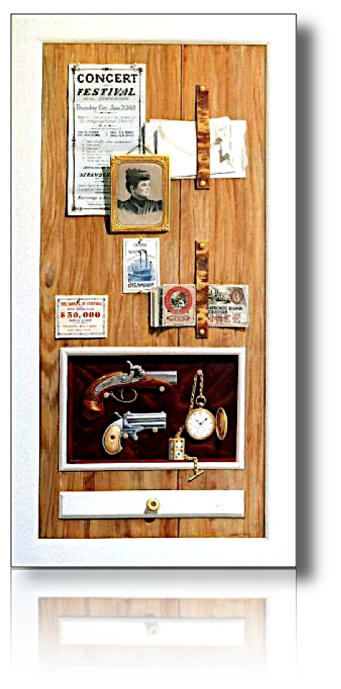 These are two of four "trompe l'oeil" (trick the eye) paintings on cupboard doors created for collector Gil Kohl. The doors are perfectly flat. Any depth perceived is painted to give that appearance. Even though the white "molding" around the edge appears to have depth, the flat surface is simply painted to look that way, as are all the shadows.