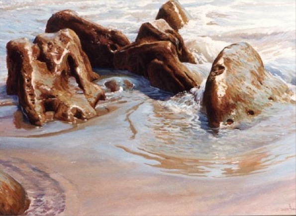 A favorite painting presently available: “It captures the water movement and the rocks that I like so much. They're like nature's sculptures. They ARE nature's sculptures. Little landscapes and seascapes unto themselves being created right before my eyes, with their own time schedule.”